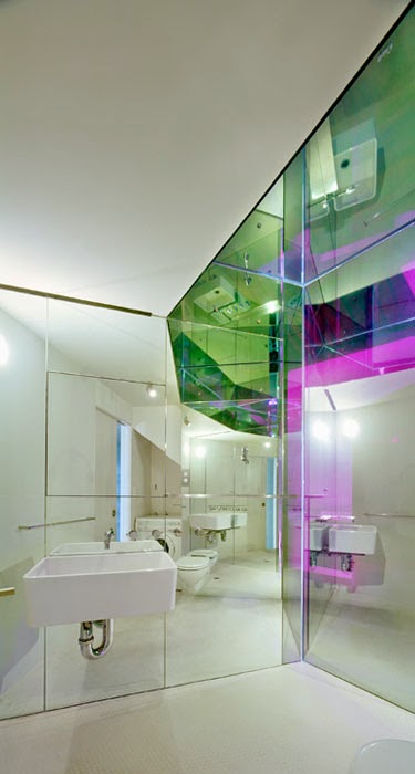 The bedroom occupies the south west corner, which links through to the main bathroom via a walk through dressing space with openings. A large rhomboid bath links the bathroom to the living space dissolving conventional separation whereby the shower screen is a large lightweight gate. The acute angle of the bedroom is negated by a mirrored wall with a window appearing to float in space.